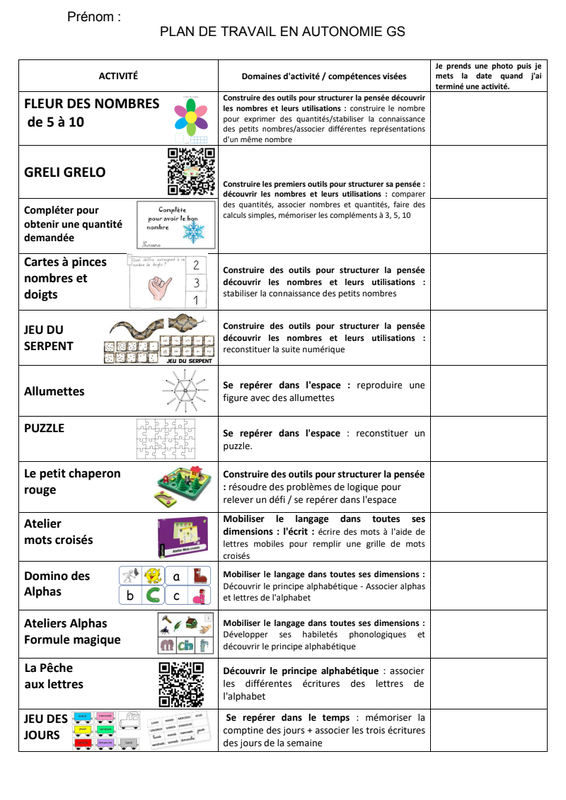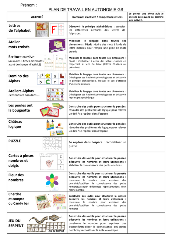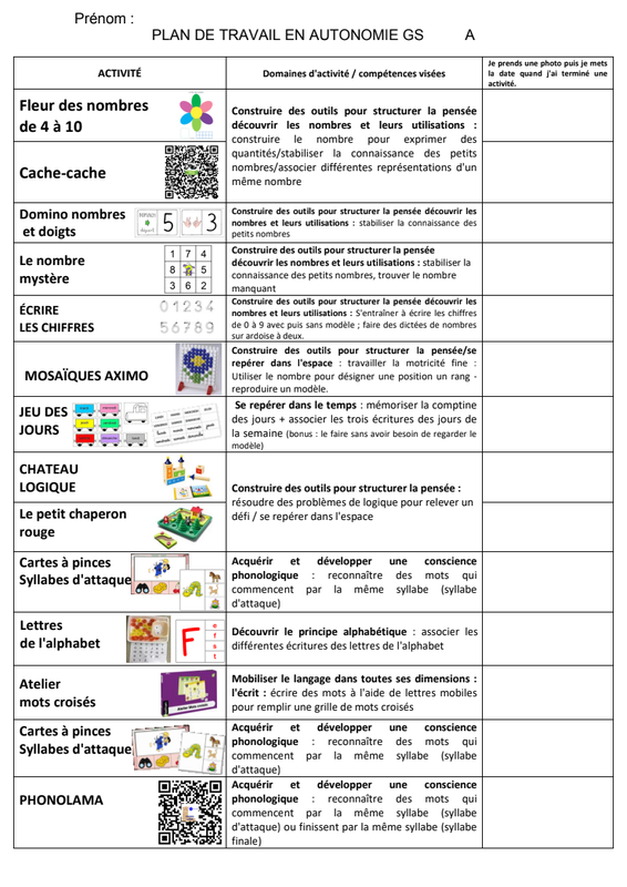 Évolution du plan de travail en cours d'année : deux versions différentes selon les groupes d'élèves (page 1, page 2) ; le plan de travail ne contient que des activités que je juge utiles pour renforcer, réinvestir les apprentissages. La règle : une activité minimum du plan de travail (selon l'avancée dans le travail) avant de choisir une des autres activités autonomes à disposition dans la classe (dont activités de motricité fine, activités artistiques, jeux de constructions...etc).