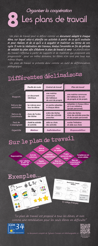 Article invité rédigé par Sandrine du site La trousse de Sobelle. Un plan de travail est un document permettant d’organiser son travail individuel réalisable sur une période donnée généralement deux ou trois semaines. Ces dernières années, le terme de « plan de travail » a été repris par d’autres courants pédagogiques. Tout le monde s’y perdait. Aujourd’hui, c’est bien le plan de travail selon Célestin Freinet dont je vais vous parler. Ces plans de travail, à l’école Freinet, existent de la maternelle au cycle 3.